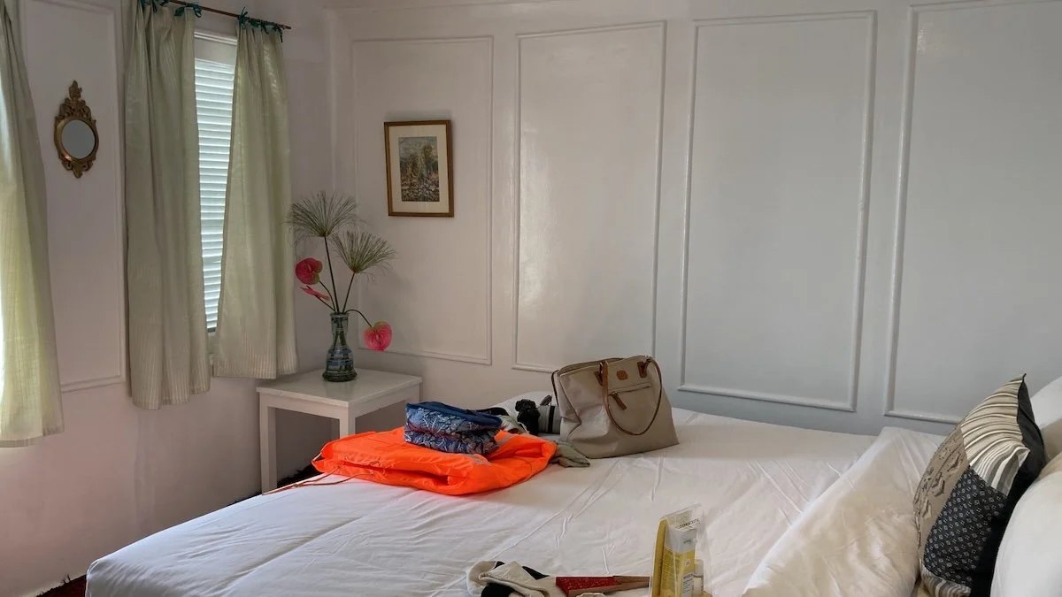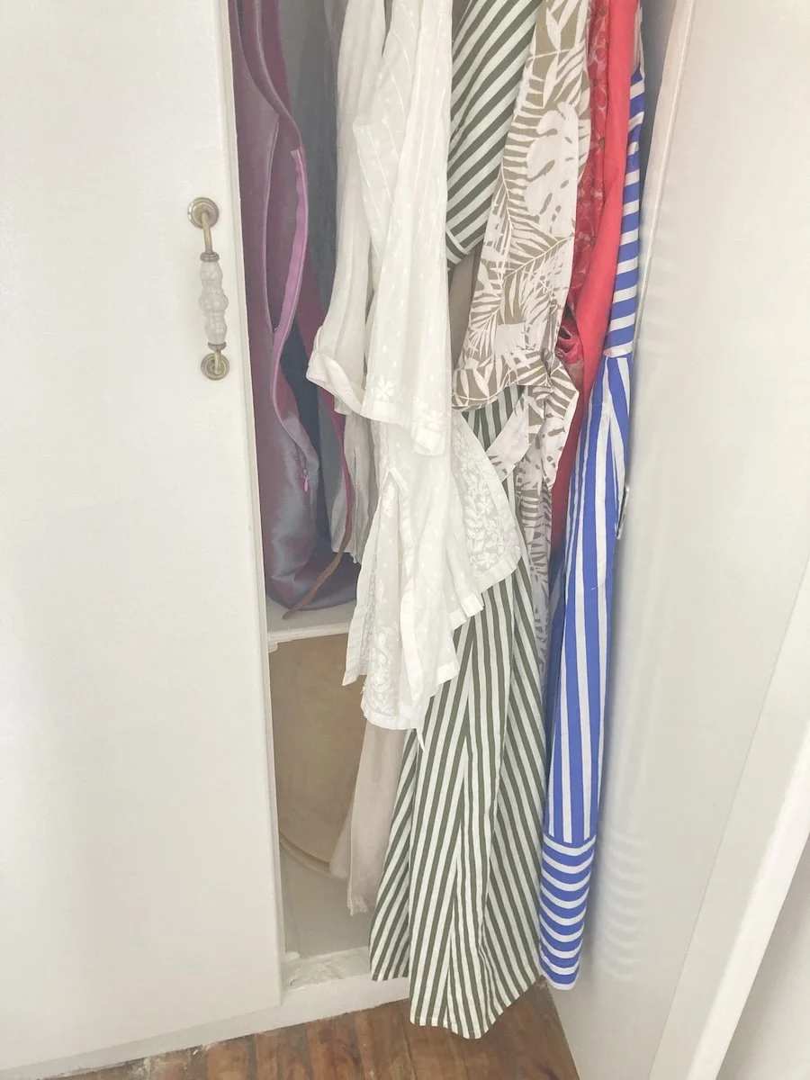 Guests with dresses need to leave the cupboard door open so the dresses can hang in front of the shelf!