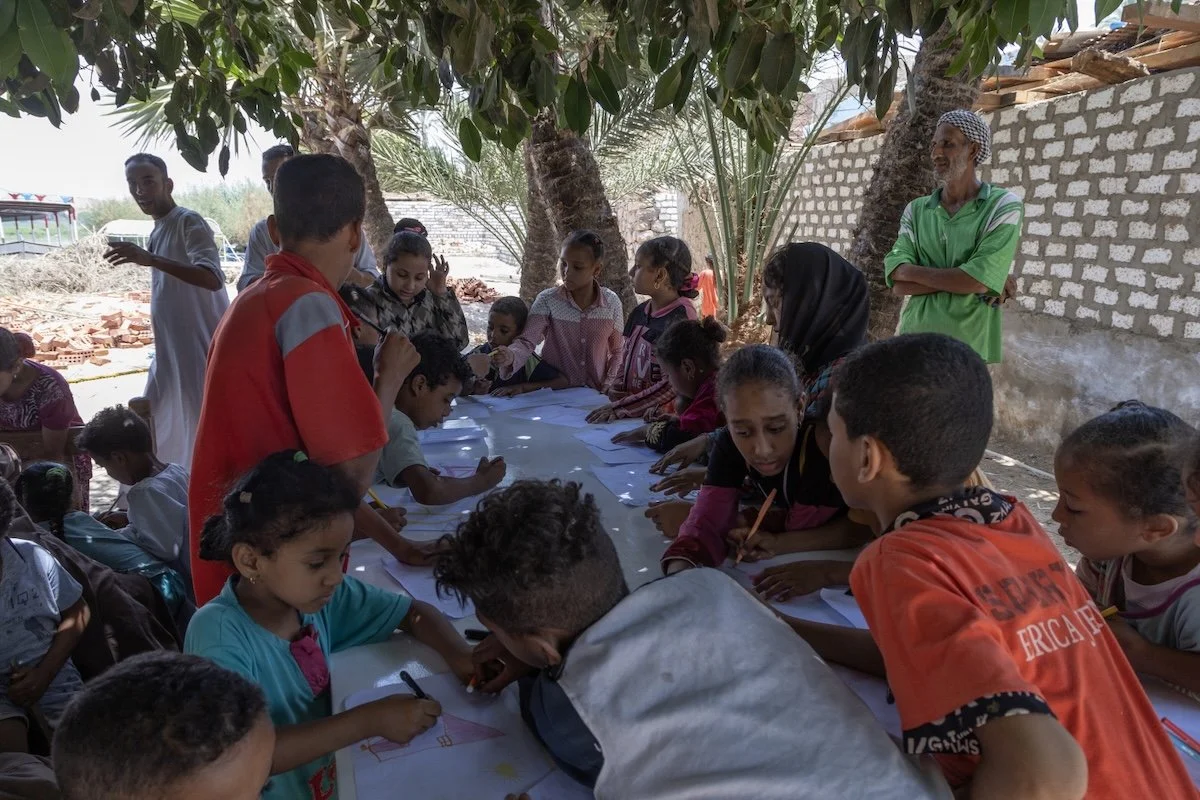One of the highlights for me of the six-night trip was the day-long stop at the village of Bisaw with its 900 or so inhabitants. We’d been requested to bring school supplies for the children and were rewarded with drawings and necklaces made with papyrus stalks. We had lunch on the shaded roof-top of a family home prepared by one of the village women. Unfortunately many of us had upset stomachs (the heat? the unaccustomed quantity of vegetables?) so were unable/unwilling to eat much of the food which looked delicious.